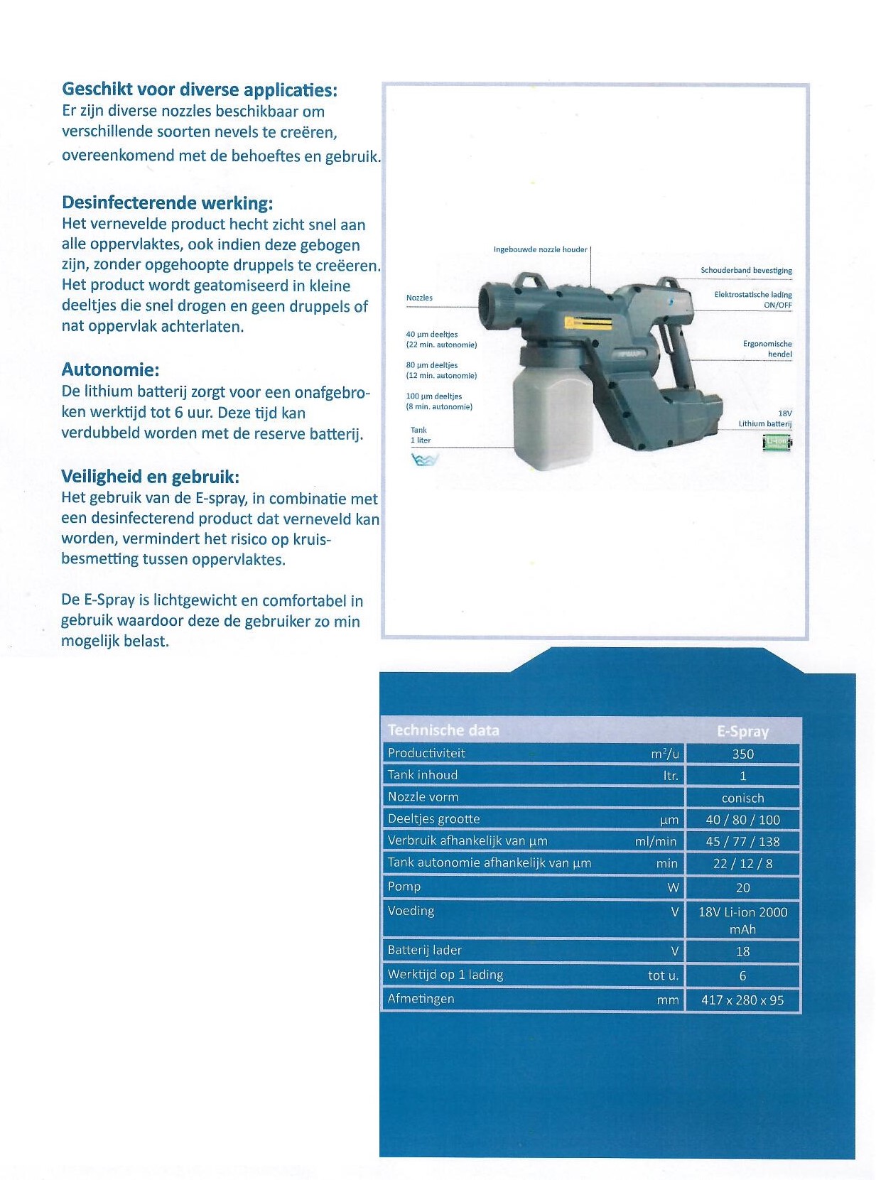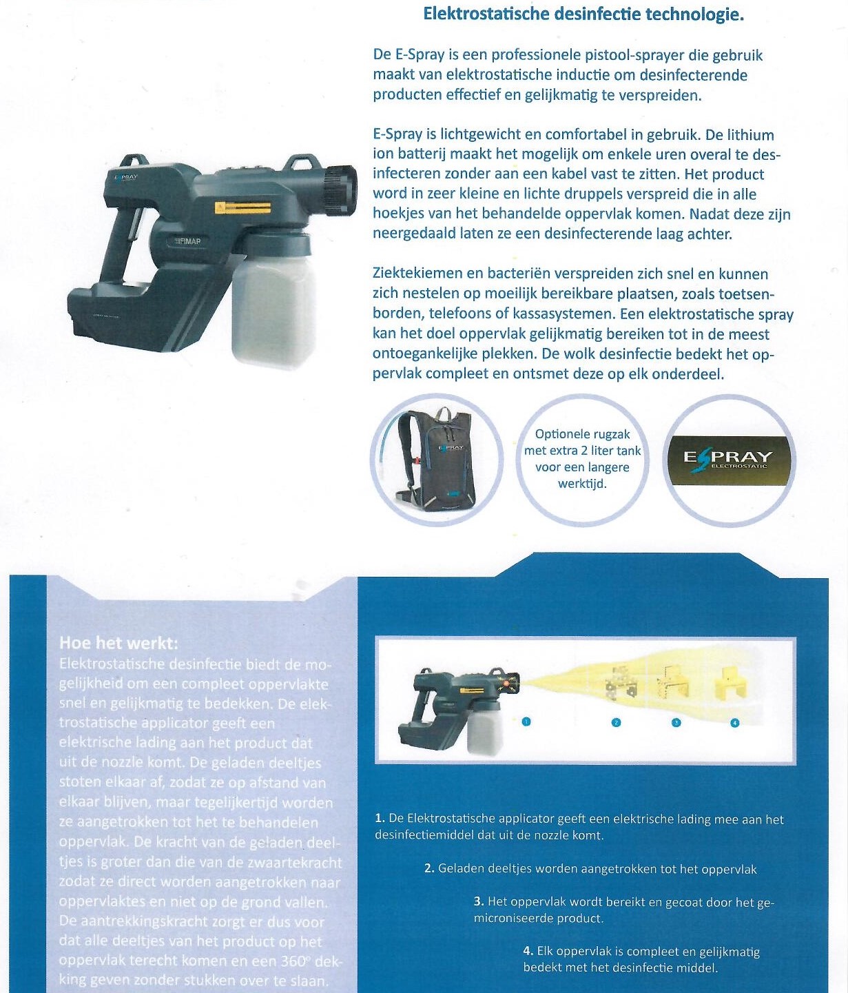 De e-spray is een professionele pistool-sprayer die gebruik maakt van elektrostatische inductie om desinfecterende producten effectief en gelijkmatig te verspreiden. E-spray is lichtgewicht en comfortabel in gebruik. De lithium ion batterij maakt het mogelijk om enkele uren overal te des- infecteren zonder aan een kabel vast te zitten. Het product word in zeer kleine en lichte druppels verspreid die in alle hoekjes van het behandelde oppervlak komen. Nadat deze zijn neergedaald laten ze een desinfecterende laag achter. Ziektekiemen en bacteriën verspreiden zich snel en kunnen zich nestelen op moeilijk bereikbare plaatsen, zoals toetsenborden, telefoons of kassasystemen. Een elektrostatische spray kan het doel oppervlak gelijkmatig bereiken tot in de meest ontoegankelijke plekken. De wolk desinfectie bedekt het oppervlak compleet en ontsmet deze op elk onderdeel.